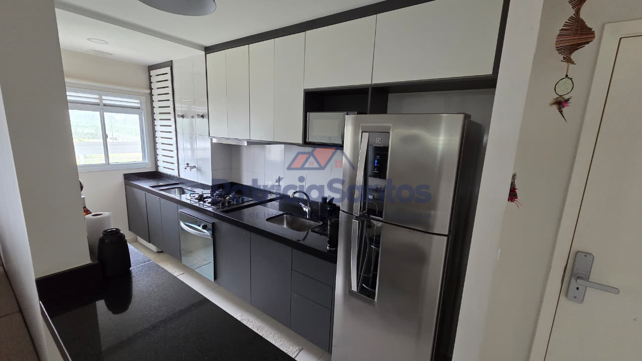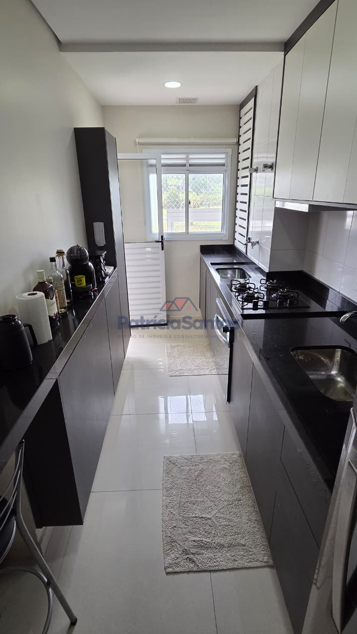 A cozinha conta com pia e bancadas em pedra São Gabriel, bancada americana, armários planejados, forno embutido a gás, cooktop a gás e aquecedor de passagem.