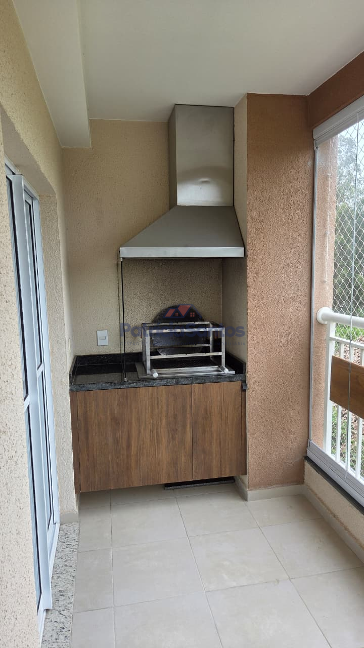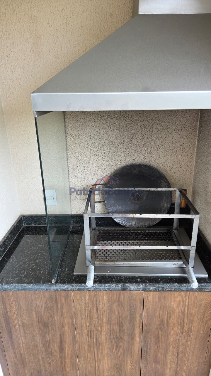 A sacada possui churrasqueira com armários planejados e fechamento total em vidro de 10 mm, proporcionando integração e conforto.