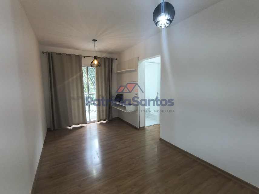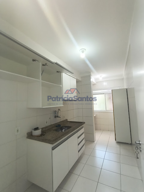 Apartamento com sacada, sala 2 ambientes, banheiro social, 2 dormitórios, cozinha e área de serviços com armários planejados e vaga de garagem.